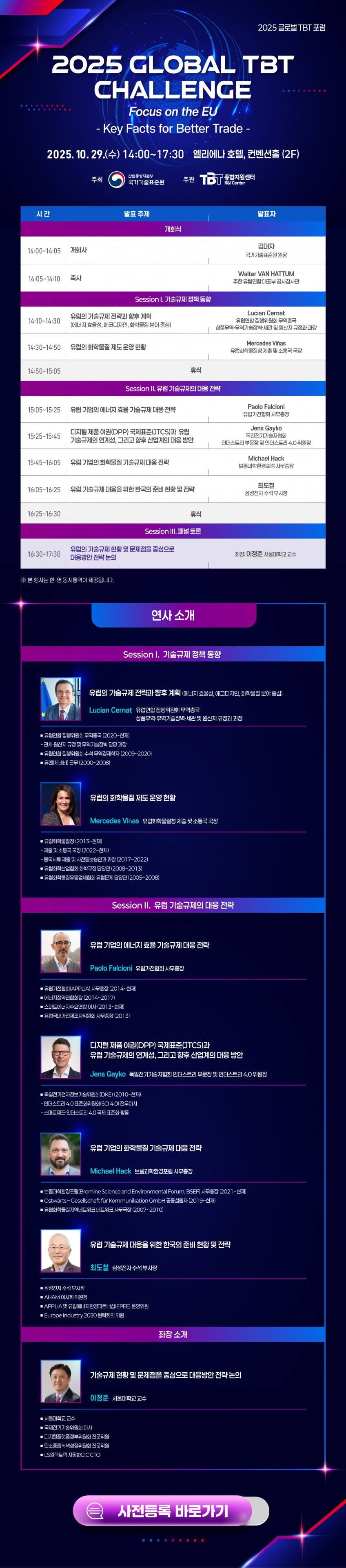 2025 글로벌 무역기술장벽(TBT) 포럼 개최 안내 페이지 정보 작성자 한국화학섬유협회 작성일25-10-17 14:12 조회71회 첨부파일 [웹포스터] 2025 글로벌 TBT 포럼 2025 GLOBAL TBT CHALLENGE - Focus on the EU.pdf 관련링크 본문 ◦신청방법 : 온라인 참가신청서 작성(https://forms.gle/E3Xjb3P1Q8oEqbfy7) 다음글 : 「순환경제 규제샌드박스 과제 기획」을 위한 수요조사 참여 요청 목록